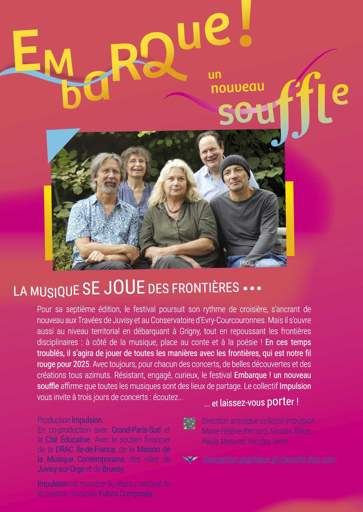 IMPULSION fédère un collectif d’artistes engagés dans la production de musiques de création et leur diffusion.